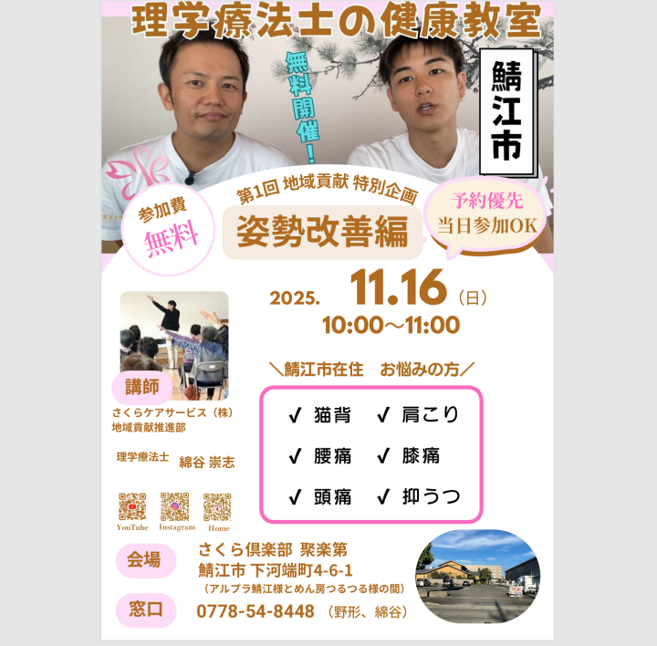 といった地域の皆さまと連携し、転倒予防、腰痛改善、姿勢改善等、健康意識付けなどなど実践型のリハビリ教室を開催しています当活動は地域貢献なので、講師料は一切いただきませんご興味ある方は、ぜひ連絡下さい!